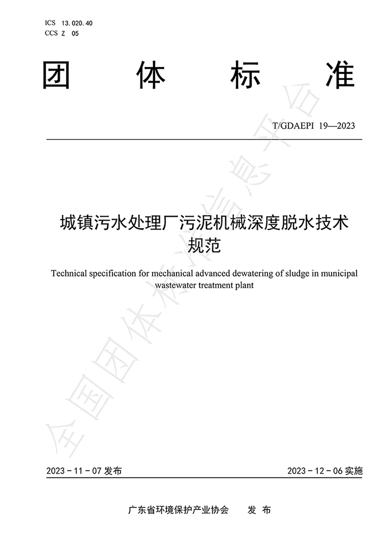 2023年11月7日,我司參與起草制定的《城鎮污水處理廠污泥機械深度脫水技術規范》(T/GDAEPI19-2023)經廣東省環境保護產業協會正式發布。