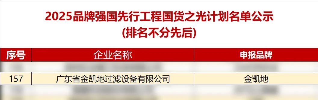 2025年1月,在“品牌強國先行工程”的嚴苛篩選中,廣東省金凱地過濾設備有限公司從申報企業中脫穎而出,榮登“國貨之光計劃”權威名單!這一由國家工業和信息化部指導、《中國工業報》聯合權威機構評定的榮譽,僅授予200家代表新質生產力與高質量發展的民族品牌。金凱地憑借技術硬實力與行業影響力成功入選,彰顯中國高端裝備制造的全球競爭力。